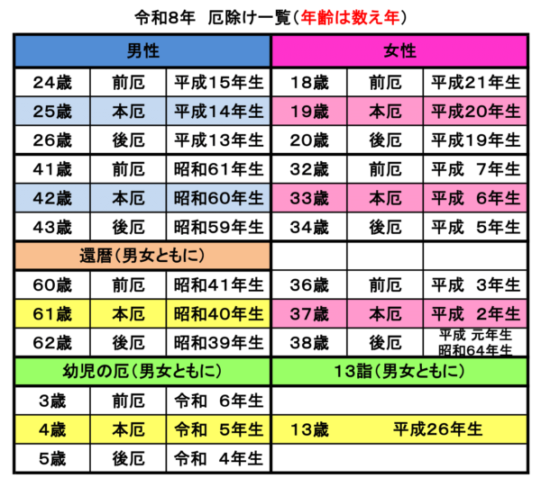 厄年は人生の中で災厄にあうことの多い節目の年とされております。