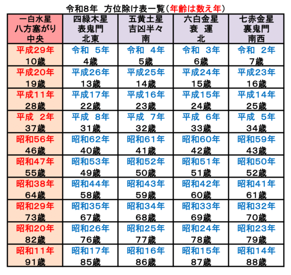 中央・・・各方位の中央に位置し、俗に言う『八方ふさがり』の時期になります。厄年でいう大厄の年。